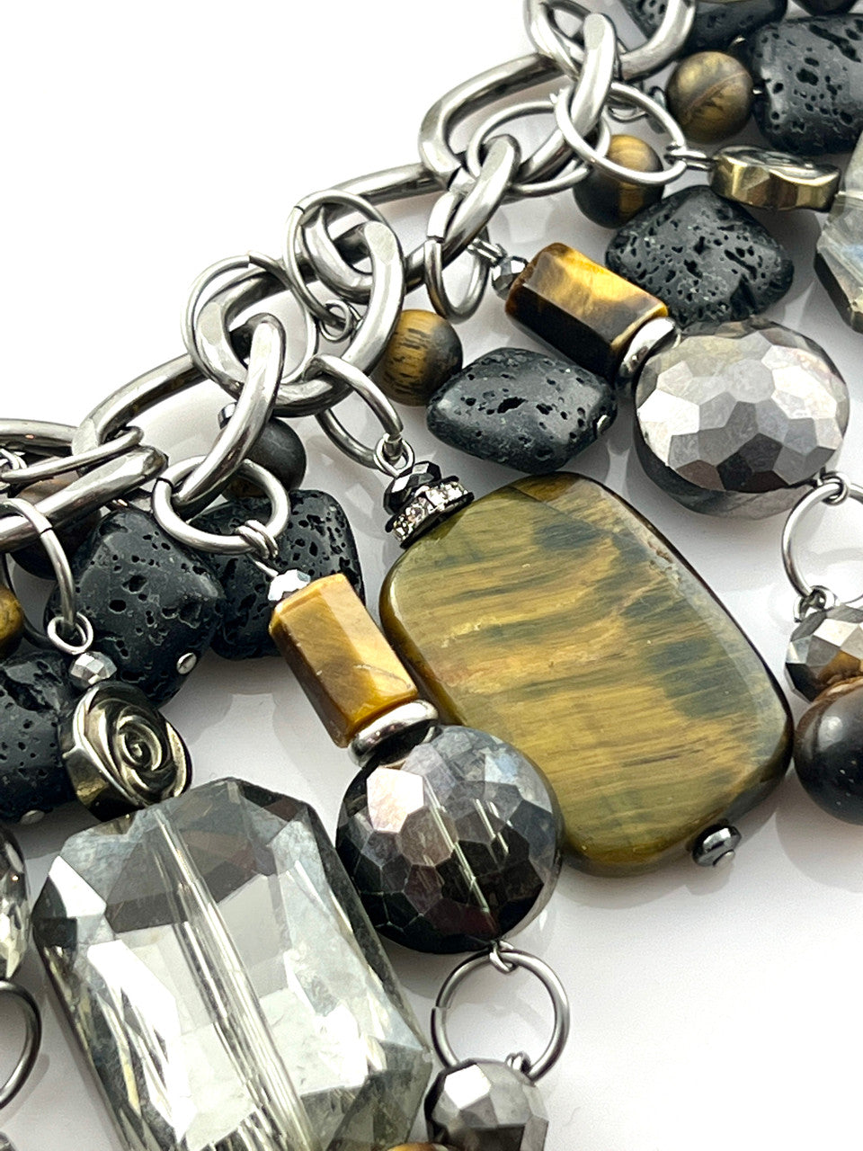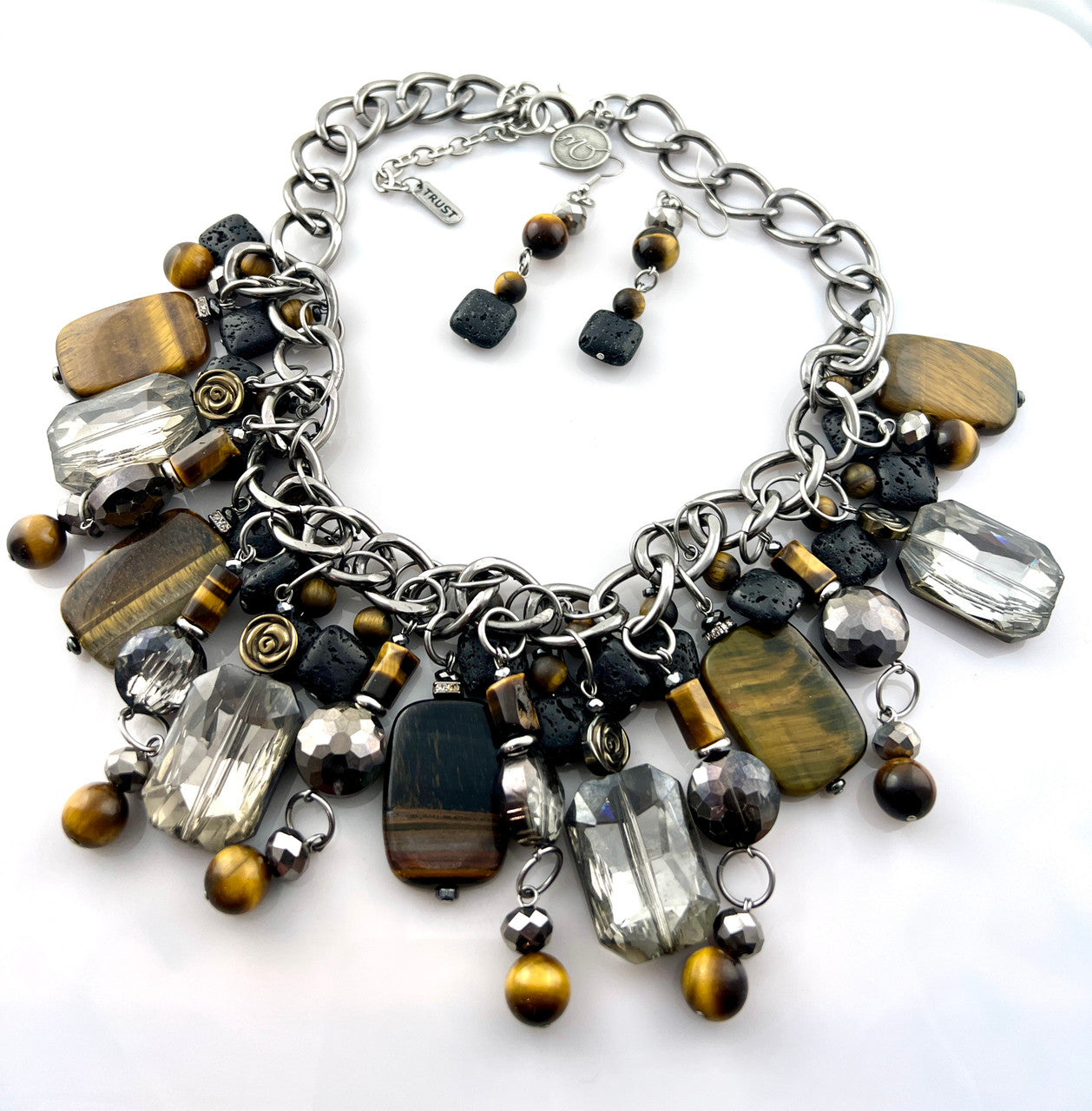 This statement necklace is filled with so much Tiger Eye, Large Tiger Eye drops, both polished and matte Tiger Eye beads in various sized and even Tiger Eye rondelles! As always there are Hematite beads as well as Electroplated Hematite roses for grounding, as well as flat square Lava beads which are also grounding, but also acts as a wonderful aromatherapy essential oil diffuser, just put a few drops of your favourite essential oils on there to enjoy the added therapeutic benefits for days! A stone of protection, Tiger Eye may also bring good luck to the wearer.  It has the power to focus the mind, promoting mental clarity, assisting us to resolve problems objectively and unclouded by emotions.  Particularly useful for healing psychosomatic illnesses, dispelling fear and anxiety.  Useful for recognising one’s own needs in relation to the needs of others.  Balancing yin-yang and energising the emotional body, Tiger Eye stabilises mood swings, imbues us with willpower, purpose, courage and self-confidence, and releases tension. Tiger Eye treats eyes, throat and reproductive organs, releases toxins, alleviates pain and is helpful in repairing broken bones and strengthening the alignment of the spinal column. Lava Stone is a grounding stone that strengthens one's connection to Mother Earth. It gives us strength and courage, allowing us stability through times of change.  It provides guidance and understanding in situations where we may need to "bounce back". A calming stone, it is very useful in dissipating anger.  It promotes positive changes where needed in behavioural issues. Lava Stone enhances fertility. Hematite focuses energy and emotions for balance between the body, mind and spirit. Dissolves negativity and prevents you from absorbing the negativity of others. Hematite is strong, supporting timidity, boosting self-esteem and survivability, enhancing willpower and reliability, and imparting confidence.   The stones are all infused with Kundalini Reiki Healing Energy