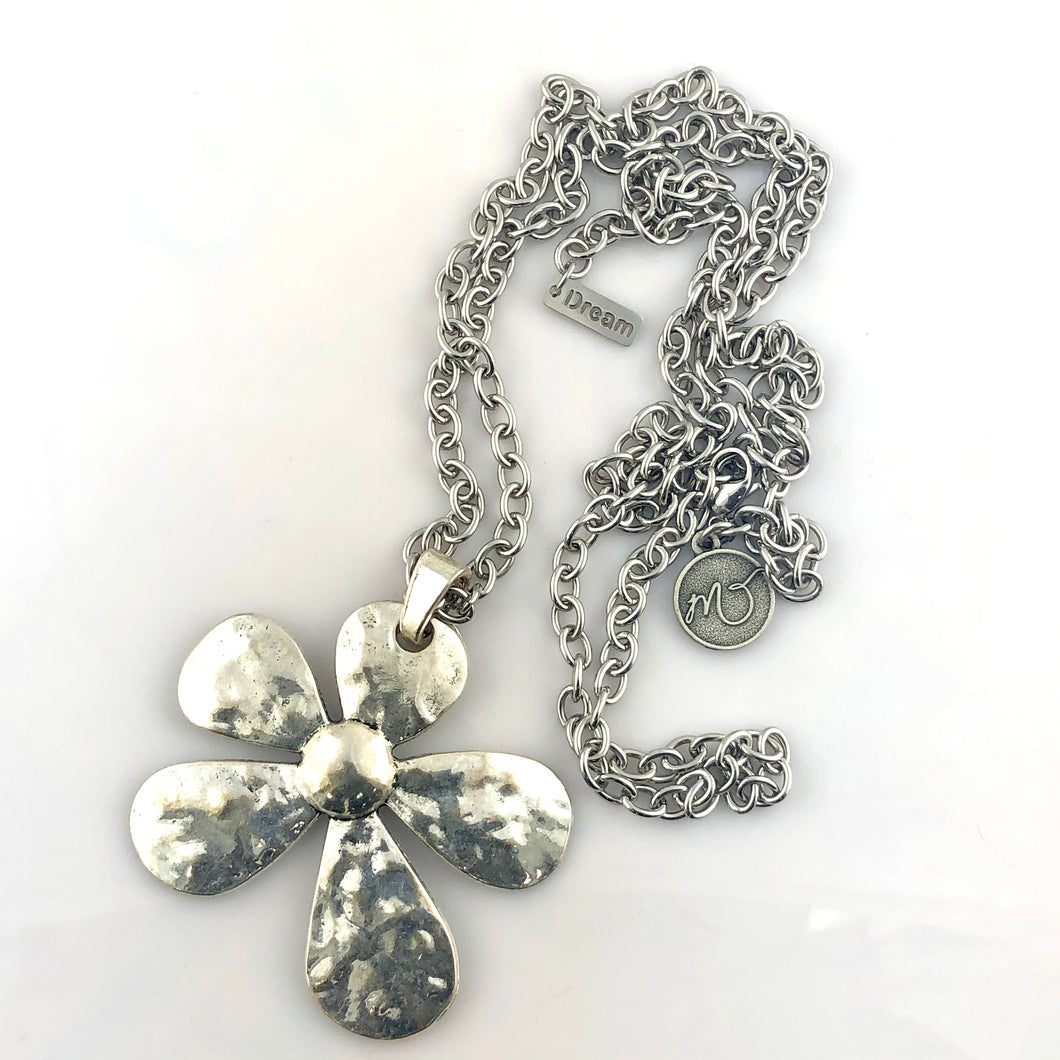 Daisy pendant on a stainless steel chain finished off with a "dream" charm. Necklace length is adjustable and can be wrapped double for a short necklace style.